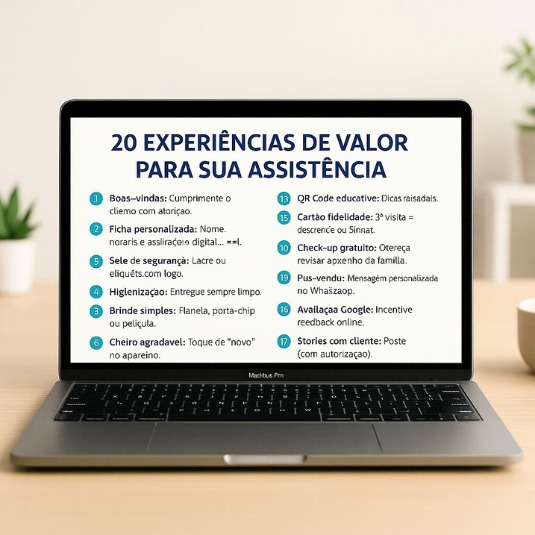 São mais de 12 exemplos de experiências que eu uso na minha assistência, que vão desde trocar um brinde por uma avaliação, até entregar vouchers no lugar de uma indicação. São ideias de qualidade para seu dia-a-adia.
